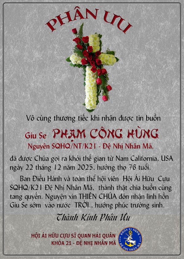 Tin Buồn: NM2 PHẠM CÔNG HÙNG, một cánh hải âu đã vĩnh viễn rời đàn K21, ngày 22 Tháng 12 năm 2025