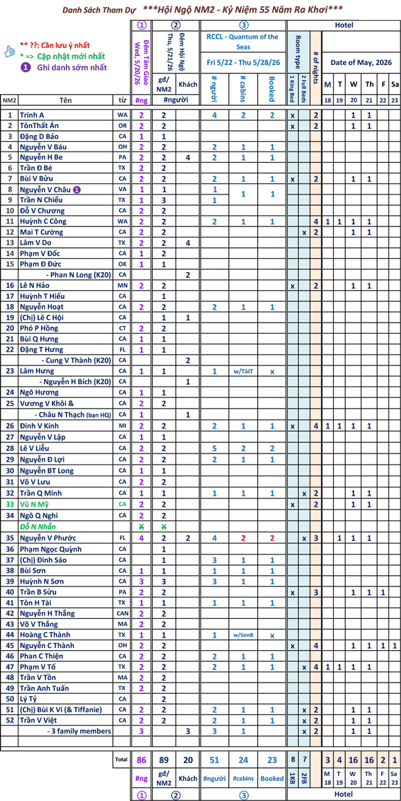 - Cập nhật: Trang Danh Sách Tham Dự nầy sẽ được thường xuyên cập nhật khi có các chi tiết cần sửa đổi.